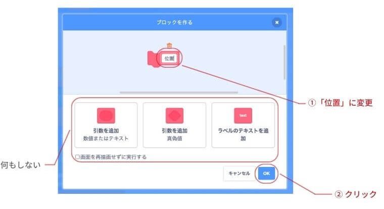 - スクラッチでは「ブロック定義」で処理をまとめることができる。