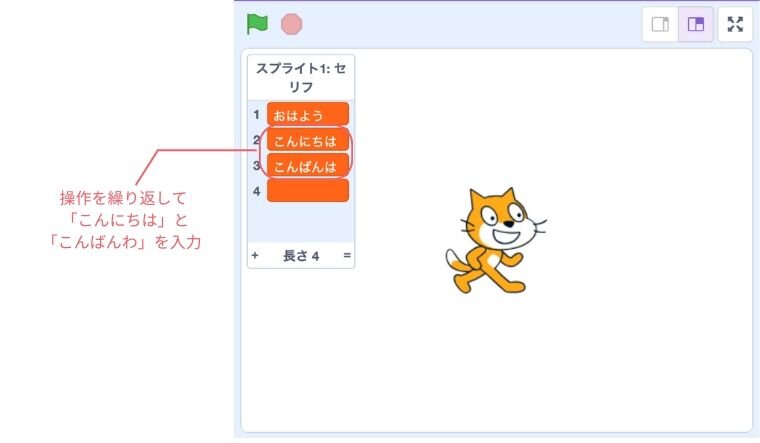 同じ操作を繰り返して、2番目には「こんにちは」、3番目には「こんばんは」というように「リスト」にデータとして「セリフ」を設定していきます。